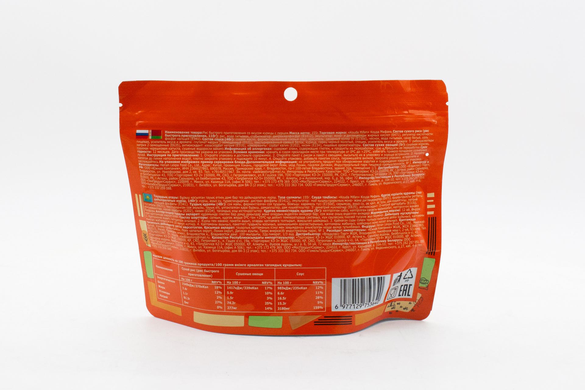 Рис быстрого приготовления Kouda Mifan со вкусом курицы с перцем (Китай) 155г0,00 руб. за штуку (в упак. 50 шт.) |